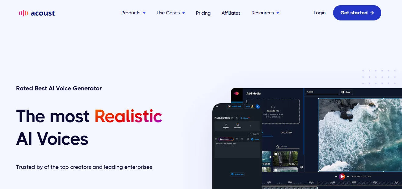 Acoust is a browser-based AI voice generation platform that combines text-to-speech, voice cloning, AI translation, a video editor, and an AI clips tool into one workspace — rated by its own homepage as the best AI voice generator for creators and enterprises.