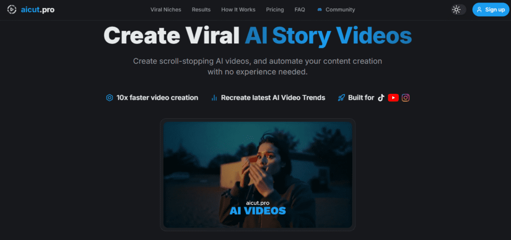 Aicut Pro is a web-based AI video generation platform specifically engineered for faceless content creators who publish short-form video on TikTok, YouTube Shorts, and Instagram Reels.