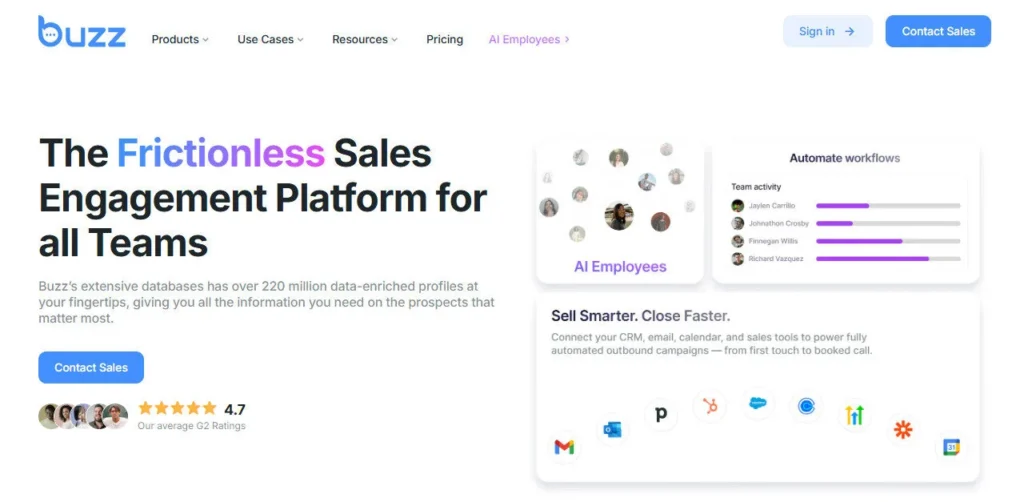 With 6,500+ sales professionals from solopreneurs to Fortune 500 companies relying on it and a 4.7/5 rating from 162 verified G2 reviews, Buzz has earned its reputation as one of the most complete sales engagement platforms on the market.