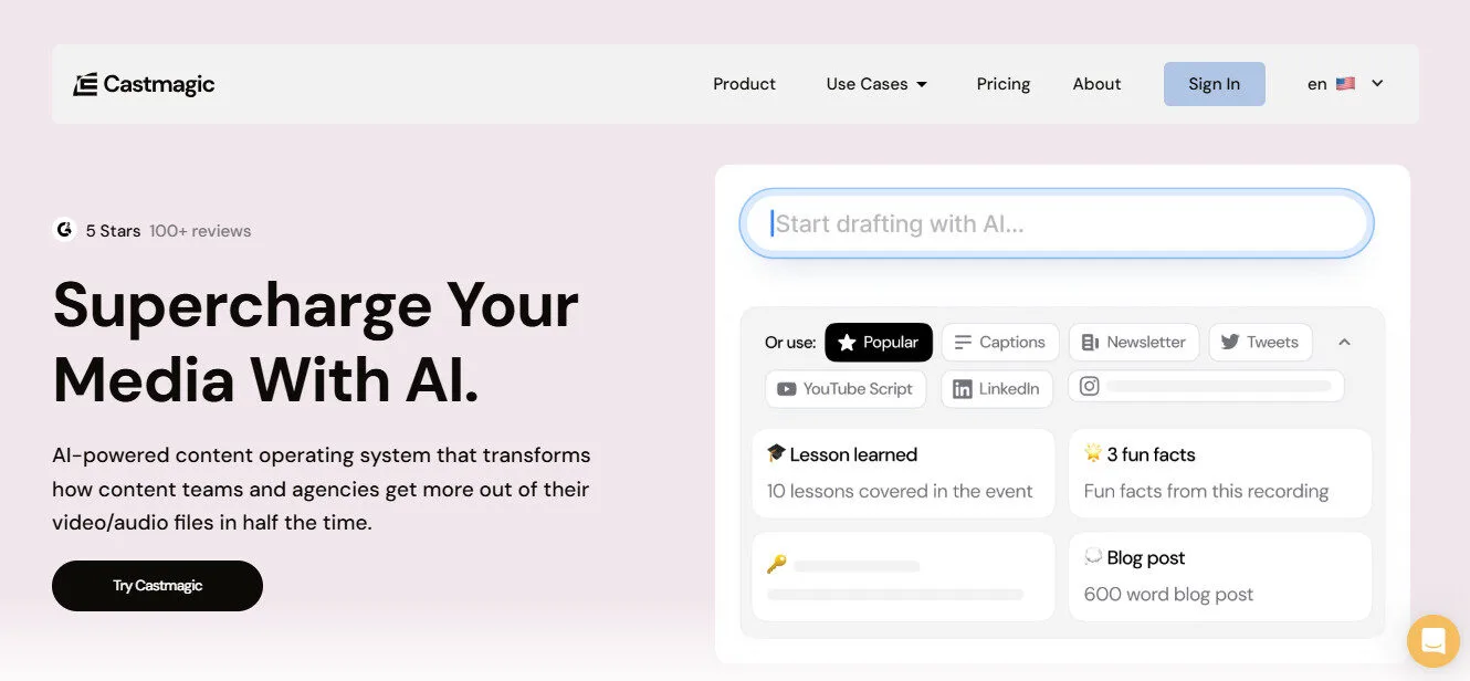 Castmagic is an AI-powered content repurposing platform that transforms audio and video recordings into 100+ content assets including transcripts, show notes, blog posts, newsletters, social captions, and lead magnets.