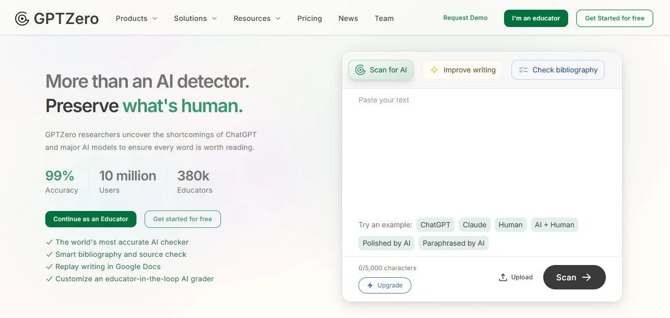 The world's most accurate AI detector — trusted by 10 million educators, publishers, and organizations in 100+ countries to identify AI-generated content with 99% precision.