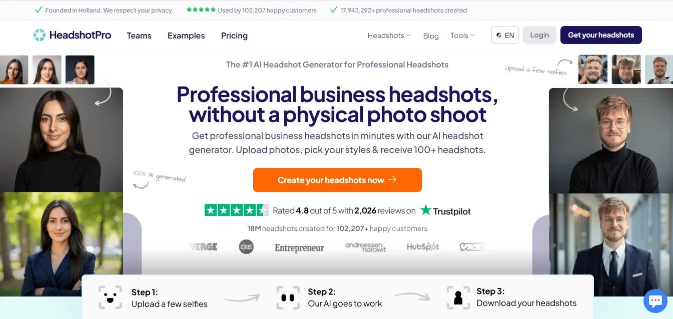 The #1 AI headshot generator built in 30 days by Dutch indie hacker Danny Postma — 197K+ customers, 17.9M+ headshots created, 4.8/5 from 3,360 Trustpilot reviews, 315+ outfits, 355+ backdrops, 14-day money-back guarantee, from $29 one-time.