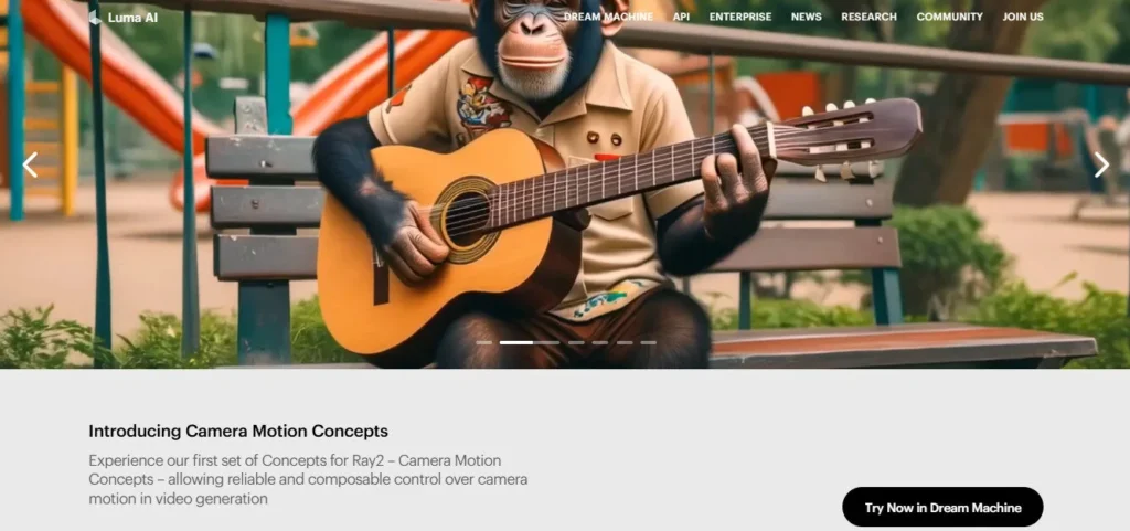 • Dream Machine API — Developers access all video, image, and audio generation models programmatically via REST API; API credits are purchased separately from web/iOS subscription credits at lumalabs.ai.