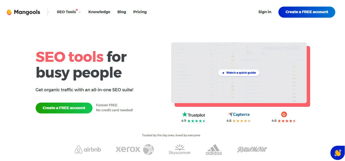 Support & Resources4.7/5Mangools' support team holds genuine SEO expertise — a homepage commitment the company backs up with consistent Capterra reviews praising 'cooperative and flexible' customer service from staff who give 'practical answers from SEO pros, not vague call-center responses.' The SEO Knowledge Hub includes a complete SEO guide for beginners with certification, 60+ link building techniques, and 28 Google rich snippets guide. Julia McCoy's endorsement specifically highlights the team quality — a meaningful signal that the support experience matches the product quality.