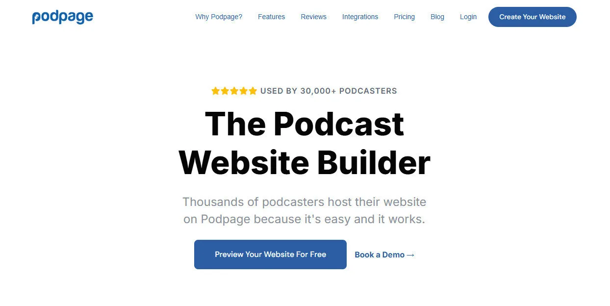 Podpage is a podcast-specific website builder trusted by 30,000+ podcasters, rated 4.8/5 across 240+ reviews, and endorsed by Adam Curry — the inventor of podcasting.