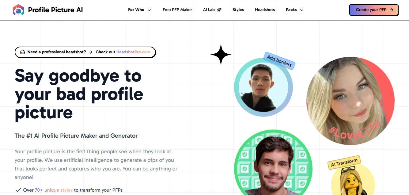 It offers three flat-tier paid plans ($8 / $14.75 / $24.75) plus a free PFP Maker, delivering 96 to 900+ AI portraits at up to 4K (4096×4096) resolution across 40+ named cinematic styles from professional LinkedIn headshots to fashion, dating, and seasonal themes.