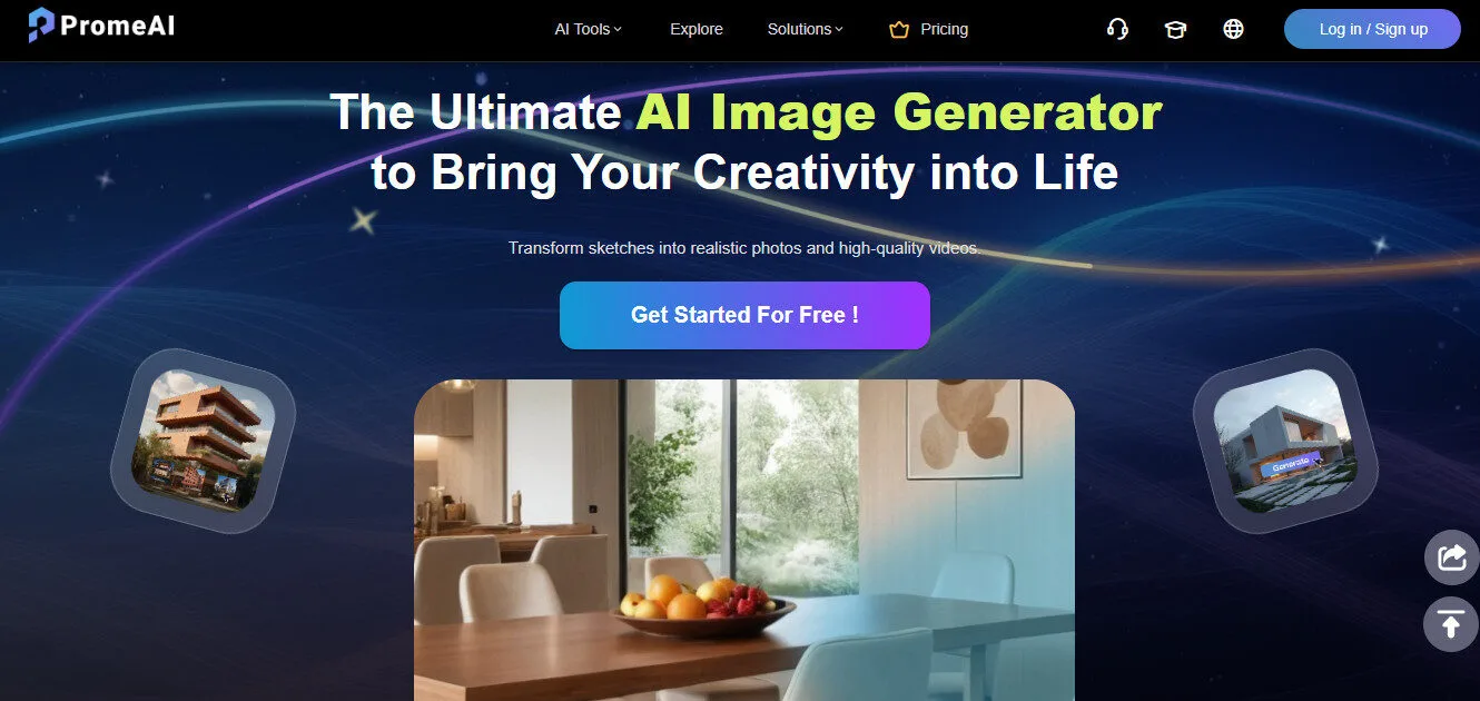 PromeAI is an AI-powered creative platform that transforms sketches, text prompts, and photos into photorealistic images and videos using over 1,700 design styles.