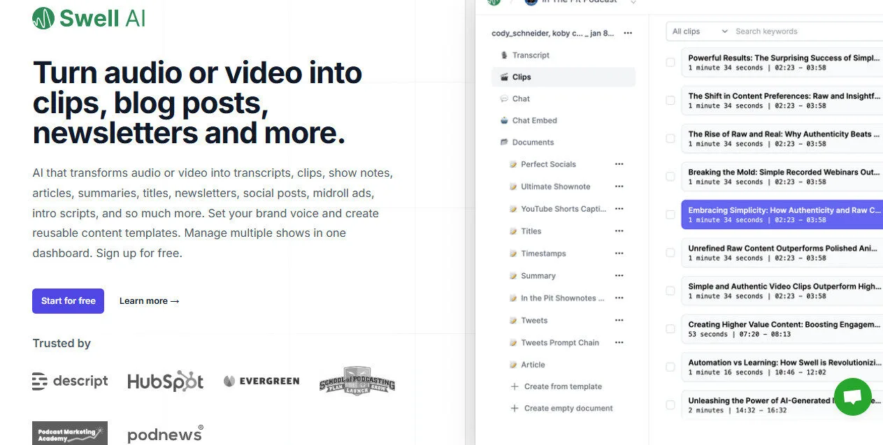 Swell AI is built for podcasters, video creators, agencies, and media companies who need to produce multi-channel content assets from recordings without hiring a separate writing or editing team.