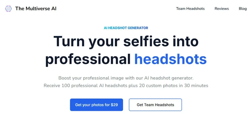 TheMultiverse AI is the most friction-free, value-dense individual-plan headshot tool in this review series — $29 for 100 professional headshots plus 20 custom prompt photos, a Flux-powered AI model, a natural language Magic Editor, 30-minute email delivery, and no registration requirement.
