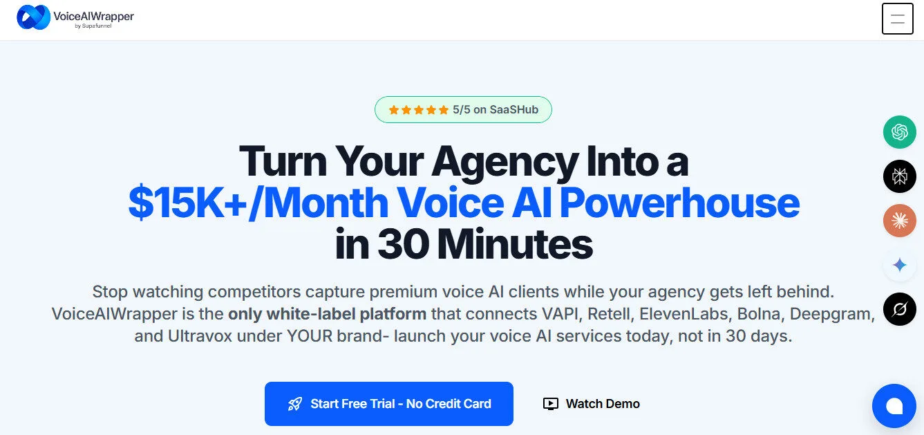 VoiceAIWrapper is a voice AI white-label platform built for agencies that lets you rebrand and resell leading voice AI providers — including ElevenLabs Conversational AI, Vapi, Retell AI, Bolna, Ultravox, and Deepgram — under your own brand, domain, and logo.