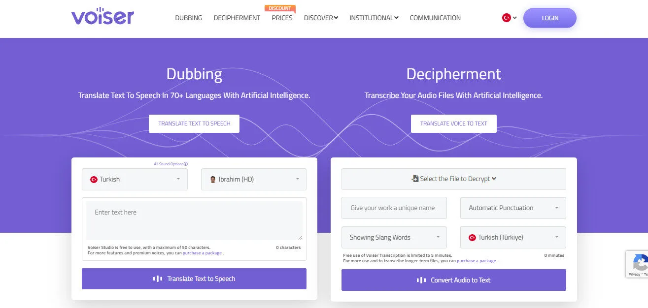 Voiser is an all-in-one AI voice and media platform offering Text-to-Speech (550+ HD voices + 40 UHD voices, 75+ languages, 140+ dialects), Speech-to-Text transcription (up to 100% accuracy, 75+ languages), Voice Cloning, YouTube Dubbing, Talking Avatars, Webreader widget, WordPress plugin, and API access.