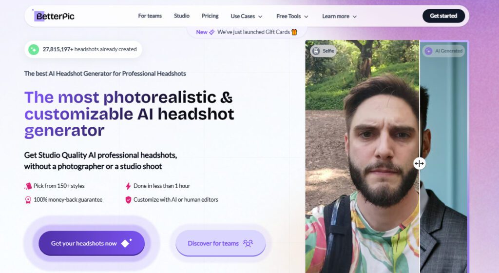 Studio-quality AI headshots and photoshoots for individuals and teams — without a photographer, studio, or waiting weeks for edited photos.