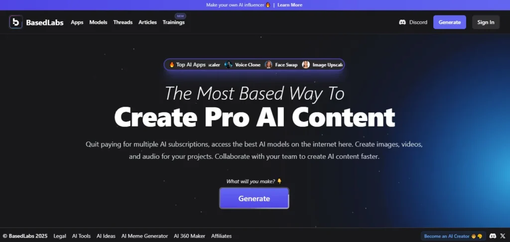 BasedLabs AI is an all-in-one AI-powered content creation platform designed to enhance visual media production. It provides tools for AI-generated videos, face swapping, and avatar creation, making it ideal for users looking to automate and streamline their content workflows.