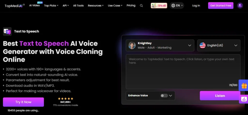 Vast Voice Library: TopMediai boasts an impressive library of over 3,200+ AI voices in more than 70 languages and accents, offering unparalleled variety for text-to-speech and voice cloning.